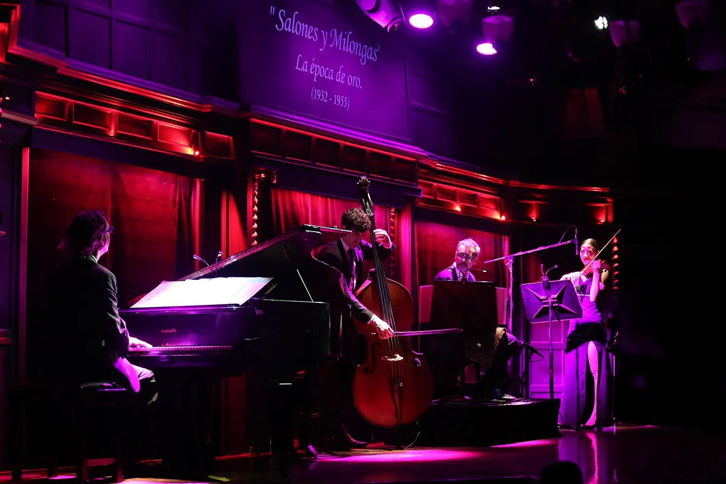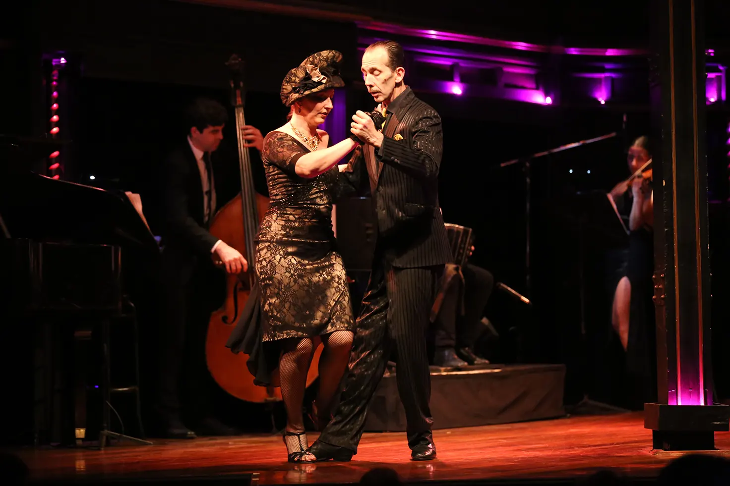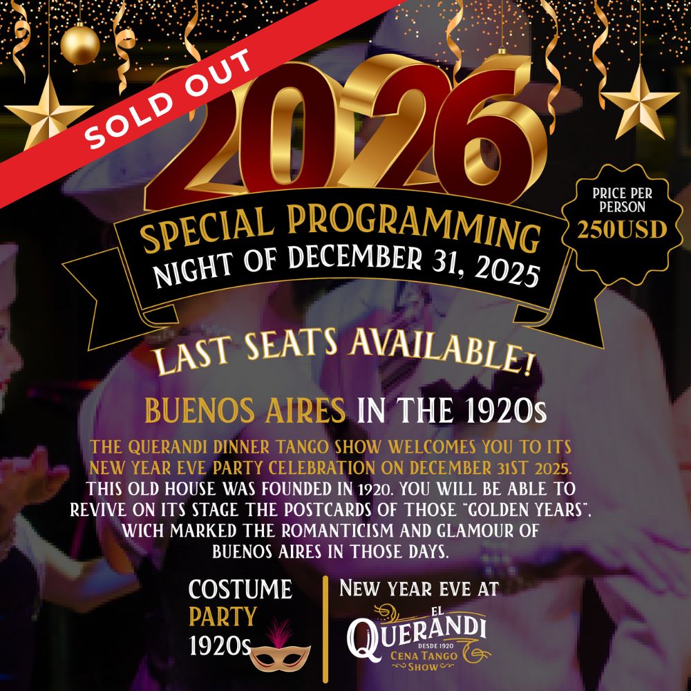 The musical that El Querandí Dinner Tango Show presents every night, titled “Nuestro Tango” (Our Tango), is performed by a cast of fourteen artists: an acoustic quartet (violin, piano, bandoneon, and double bass), four pairs of dancers, and two singers.