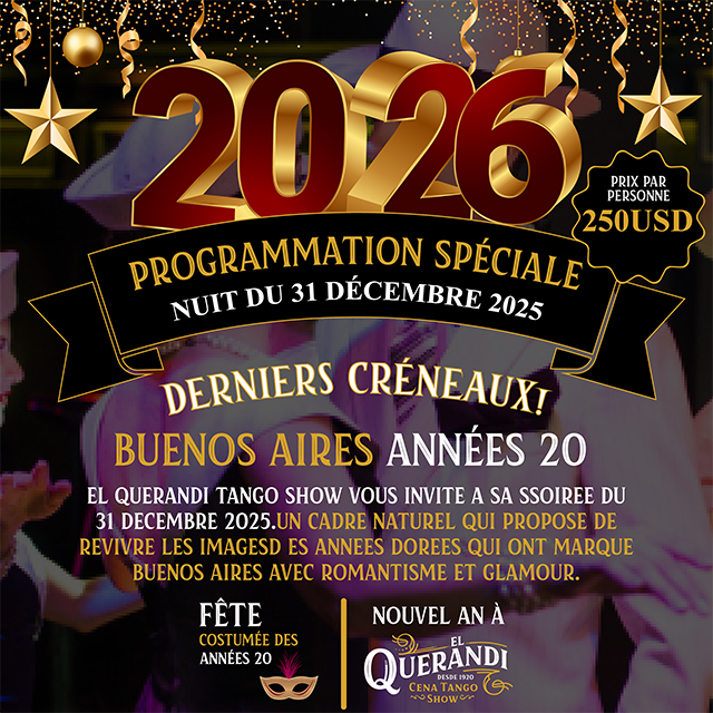 El Querandí vous invite à vous plonger dans le Buenos Aires du début du XXe siècle, à parcourir l’histoire du tango, à la vivre de manière intense et passionnée à travers ses accords rythmés et la sensualité de sa danse, pour ensuite la garder vivante à jamais dans votre mémoire. Notre spectacle, surprenant par la qualité et le prestige de ses artistes, nous permet de revivre l’histoire du tango soir après soir, après avoir savouré le meilleur de la cuisine argentine. Nous explorons toutes les époques du tango, depuis ses “Origines”, “Immigrants et Faubourgs”, “Gardel, le Tango-Chanson”, “Salons et Milongas”, jusqu’à “Le Modernisme, Astor Piazzolla”.